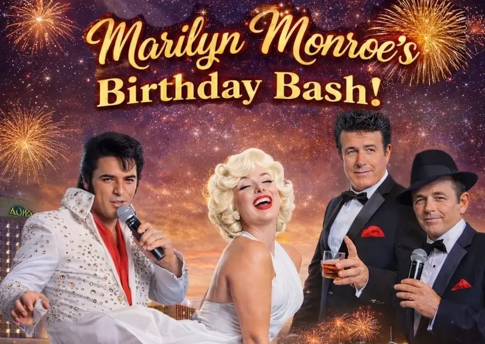Live entertainment featuring the Marilyn Manore and her brithday attendees, Elvis, Frank Sinatra, Dean Martin, Andy Williams, and Tony Bennet! – a Rat Pack-style performance with music, comedy, and glamour